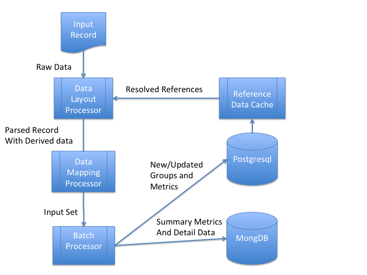 - The input set is passed to the BatchProcessor. This processor resolves the groups to their internal ids, creating new groups as needed. It also maintains accumulators for each unique group combination that accumulate metric values to both the daily and interval levels for the batch as a whole. As each record is processed, the detail data is passed off to the detail writer for saving to the mongodb detail collection.
